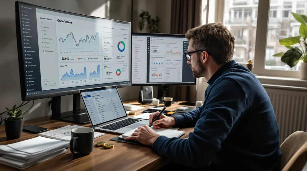 Investor drafting crypto owner’s memo with risk rules and thesis board.
